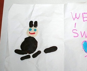 Na pierwszy rzut oka świąteczna kartka wygląda na dziecięce wykonanie laurki z okazji świąt – życzenia i symboliczny, wielkanocny zajączek wykonany z brązowej plasteliny, która dla doświadczonego palacza od razu wydaje się być podejrzana. Z pewnością z twórczość dziecka ingerowała osoba dorosła.
